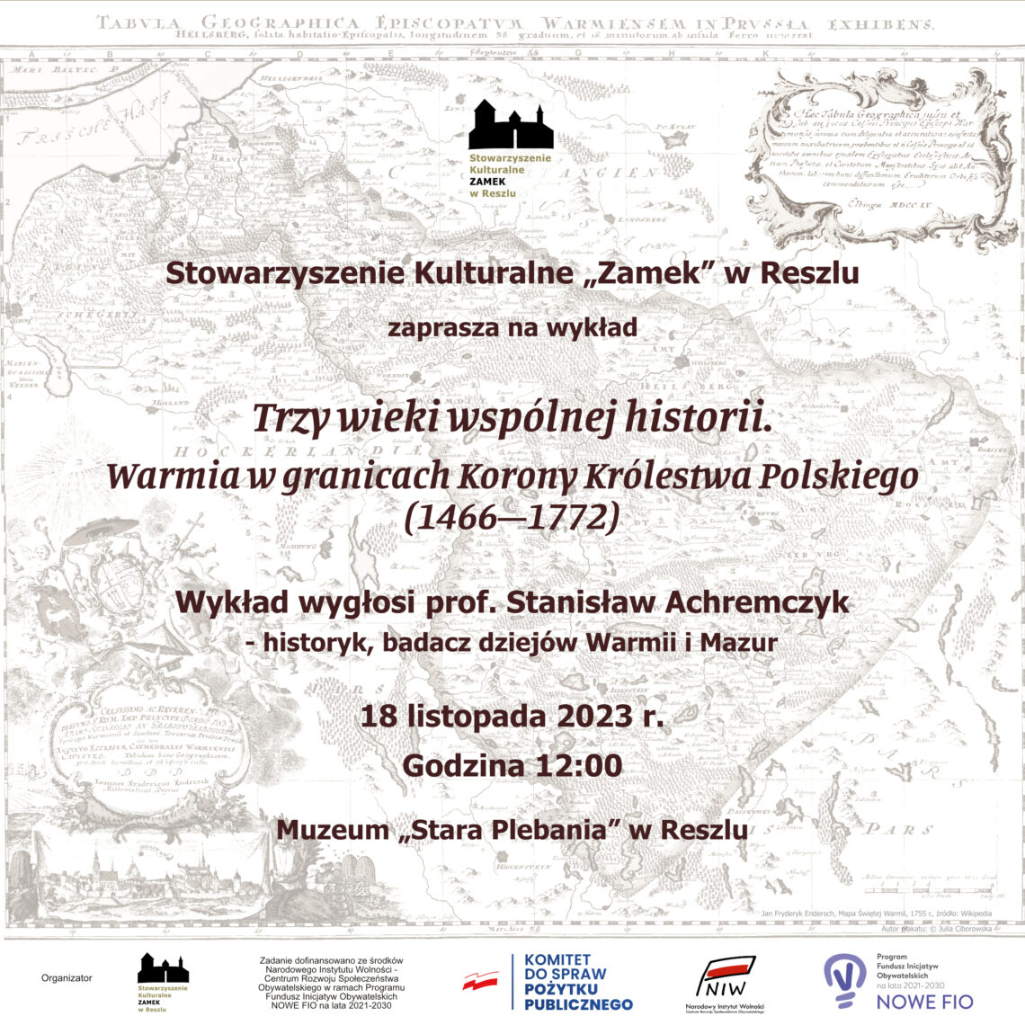 Zapraszamy serdecznie na wykład „Trzy wieki wspólnej historii. Warmia w granicach Korony Królestwa Polskiego 1466–1772„, który odbędzie się 18 listopada 2023 r. o godzinie 12:00 w Muzeum „Stara Plebania” w Reszlu.